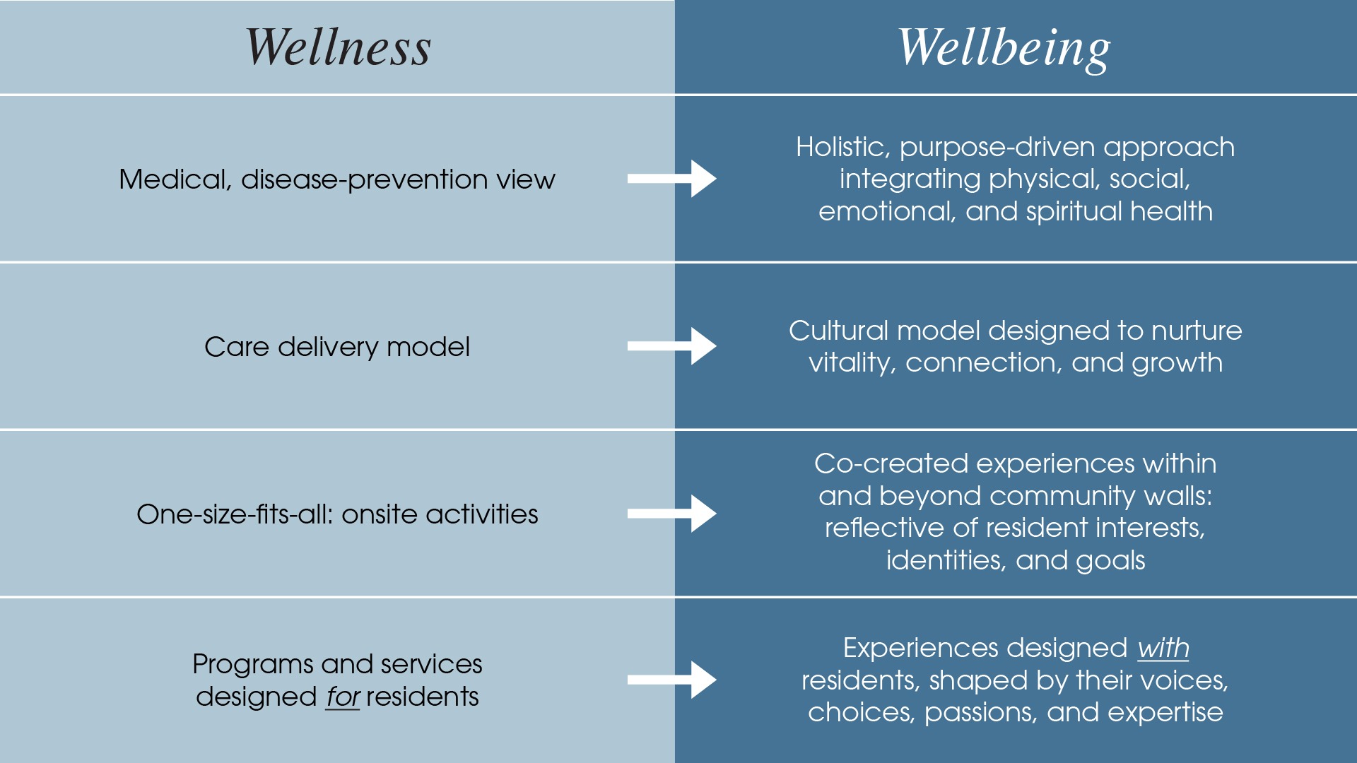 In senior living, language shapes how we design experiences for residents and the ways they can grow, connect, and find purpose. For years, “wellness” has served as a guiding principle—focused on physical health, disease prevention, and fitness. But as resident expectations evolve, a new term is emerging at the forefront of senior living design: well-being.